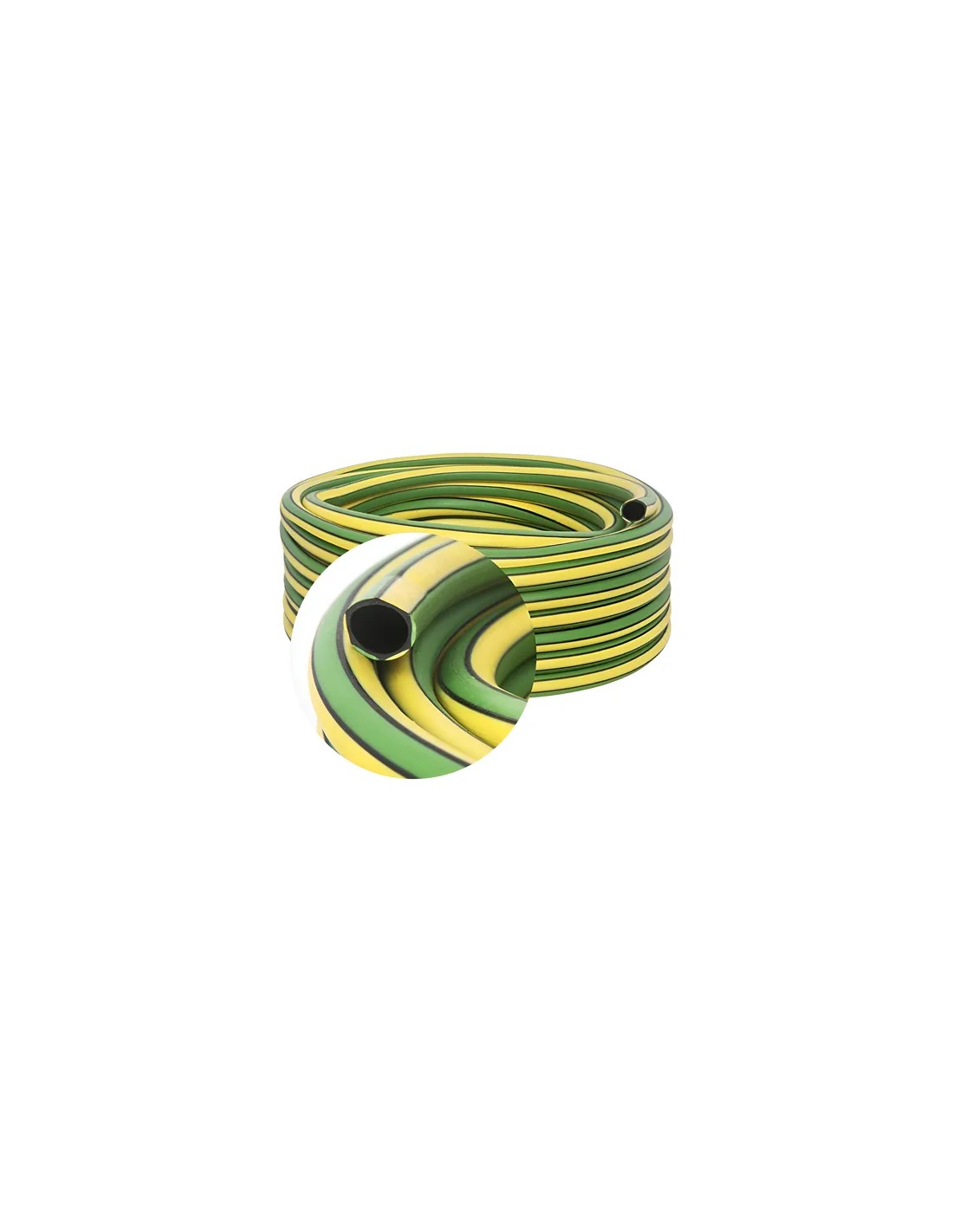 Manguera de alta flexibilidad fabricada con PVC. Libre de cadmio y plomo. Exterior presentado en bandas decorativas de varios colores (verde y blanco) y nervios longitudinales que permiten gran maleabilidad, su interior es negro. Resistente a los rayos UV y apta para la intemperie. Altísima vida útil. Temperatura de trabajo 2 °C a 60 °C.