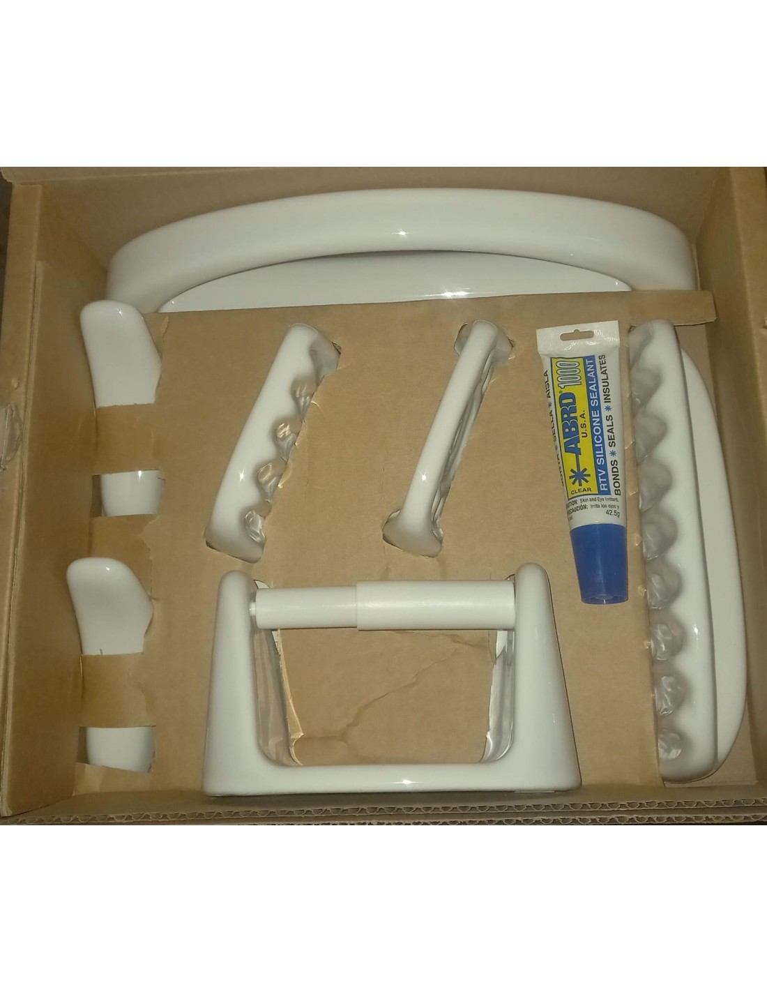 Accesorios para baño en kit de 7 piezas. Fabricado en porcelana sanitaria color blanco y acabado brillante. Excelente durabilidad, de fácil limpieza.